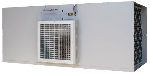 The Airephase LE (photo to the right) is a self-contained ceiling mounted air cleaner with mid-body exhaust. Placing the fan midpoint in the unit allows for equal draw from two